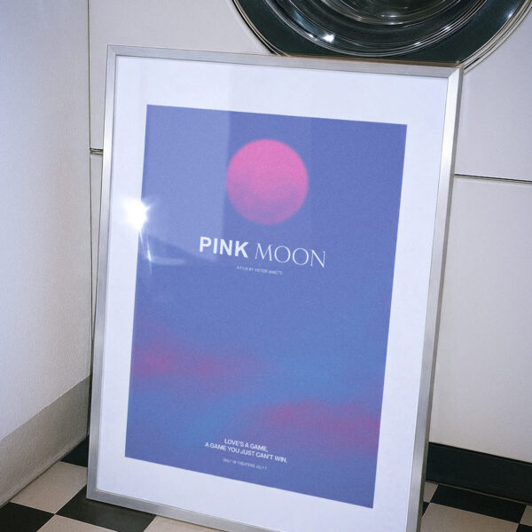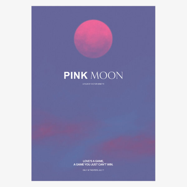 A minimalist film poster capturing the essence of "Pink Moon" — a cinematic journey through love and its impossible games. Designed in Belgium by Studio Ninette.